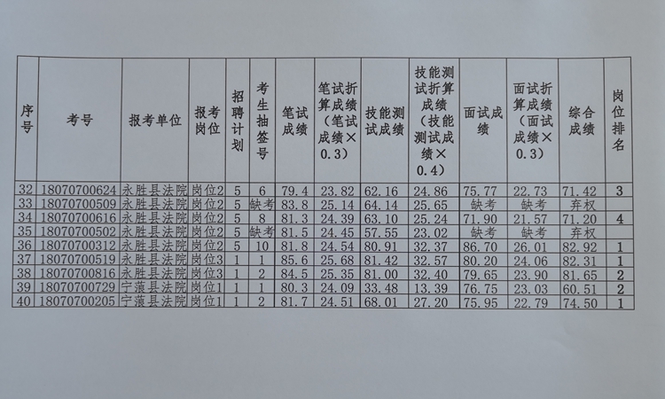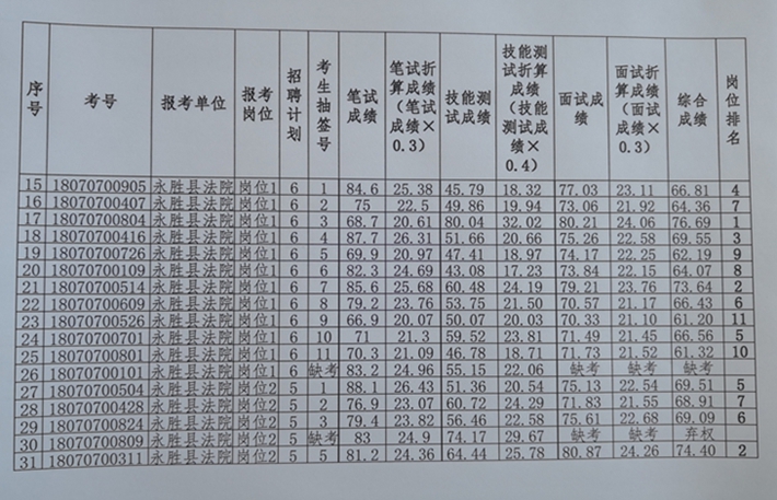 根據(jù)《云南省法院系統(tǒng)2018年公開招聘聘用制書記員公告》和《麗江市法院系統(tǒng)2018年公開招聘聘用制書記員崗位技能測(cè)試及面試公告》,現(xiàn)將麗江市法院系統(tǒng)2018年公開招聘聘用制書記員綜合成績(jī)公告于下:1、報(bào)考人員綜合成績(jī)根據(jù)3:4:3比例確定,總分為100分,即筆試成績(jī)占綜合成績(jī)的30%,崗位技能測(cè)試成績(jī)占綜合成績(jī)的40%,面試成績(jī)占綜合成績(jī)的30%。各類成績(jī)折算如出現(xiàn)小數(shù),保留小數(shù)點(diǎn)后兩位。綜合成績(jī)低于60分的,不得進(jìn)入后續(xù)招聘程序。2、根據(jù)報(bào)考人員綜合成績(jī)排名,按照各崗位招聘計(jì)劃等額確定體檢人員名單。體檢費(fèi)用由報(bào)考人員自己承擔(dān)。3、麗江市法院系統(tǒng)2018年公開招聘聘用制書記員綜合成績(jī)?nèi)缟蠄D。