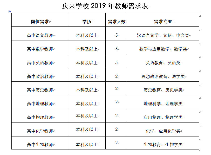 五、附件《慶來學(xué)校2019年教師需求表》