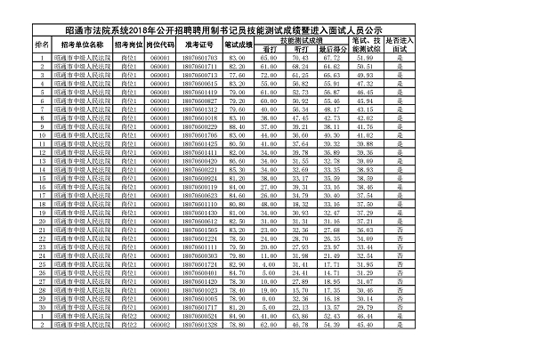附件:昭通市法院系統(tǒng)2018年度公開招聘聘用制書記員技能測試成績公示暨進(jìn)入面試考生名冊。