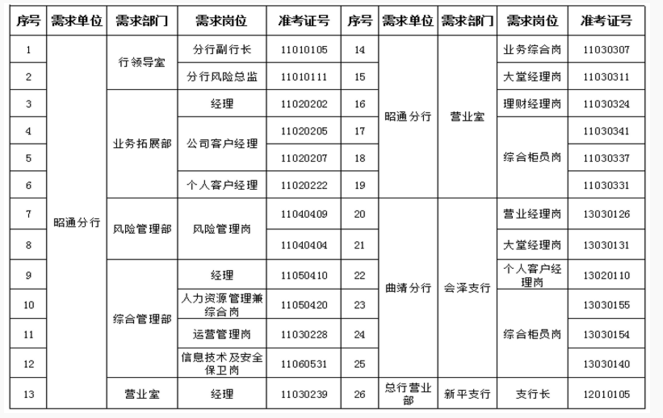 2.由于昭通分行行長崗、會澤支行理財經(jīng)理崗筆試參考人數(shù)不符合我行最低參考要求,故本次招聘取消以上2崗位的人員招錄。