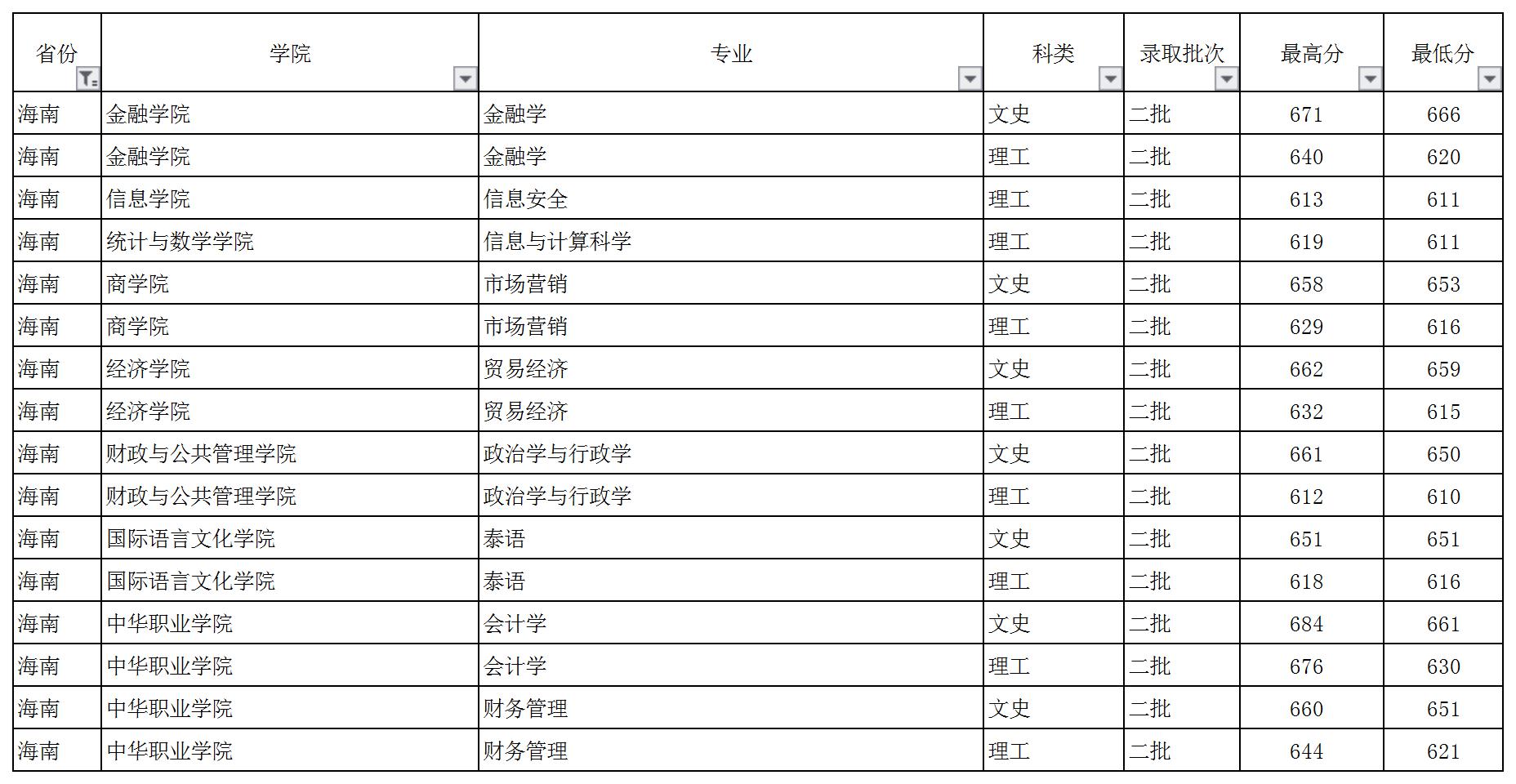 云南財(cái)經(jīng)大學(xué)2018年海南省錄取情況一覽表