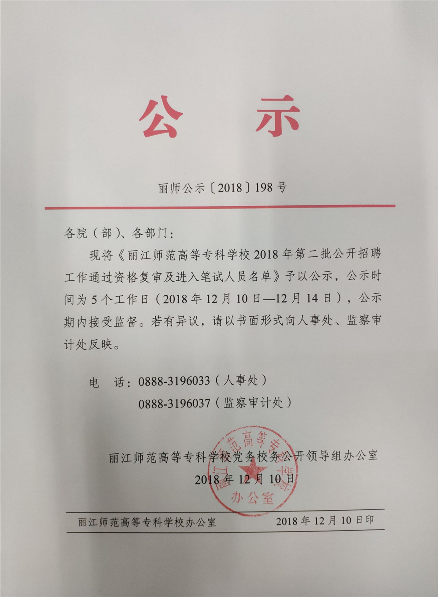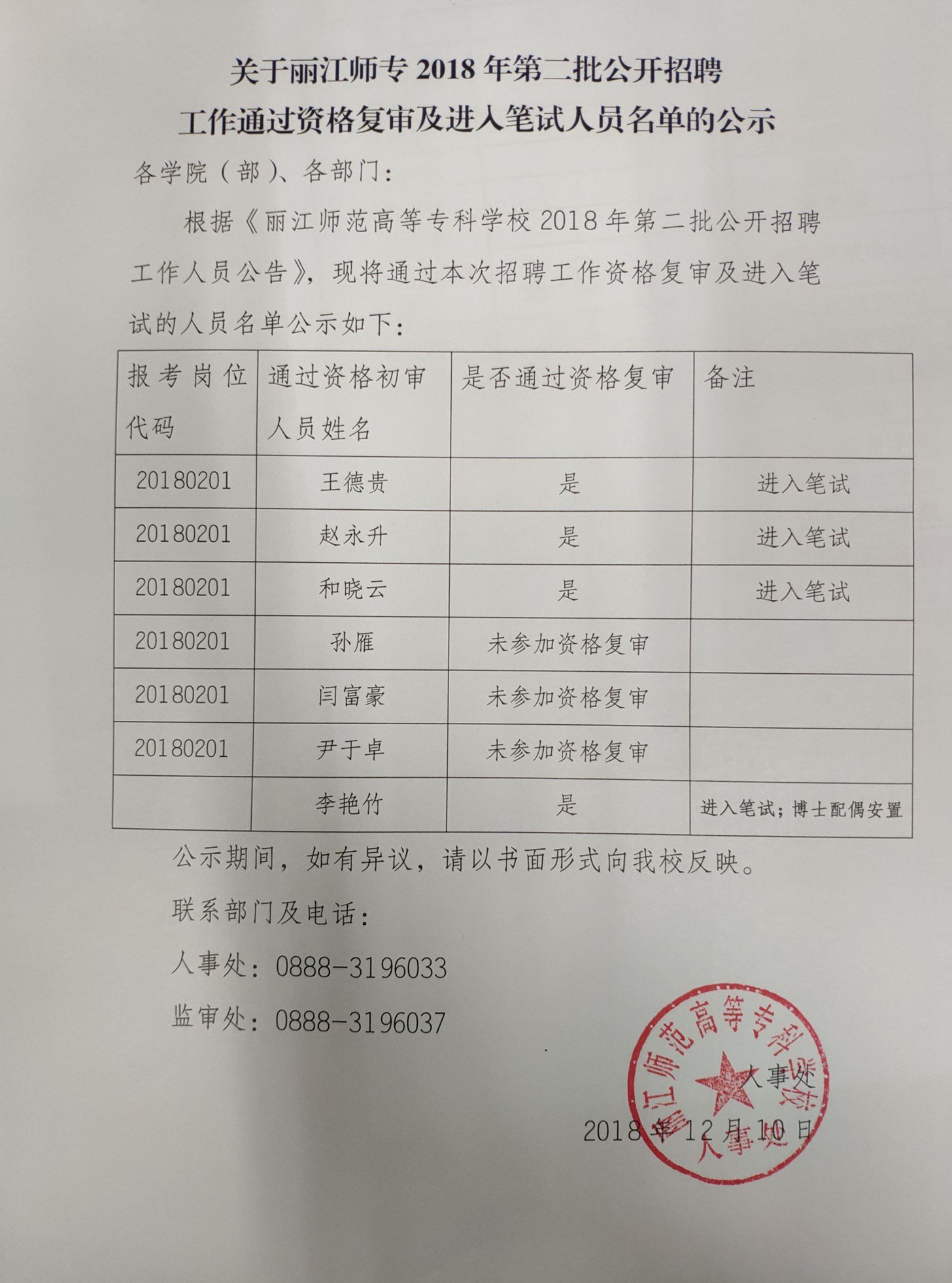 麗江師專2018年第二批招聘工作通過(guò)資格復(fù)審及筆試人員名單公示