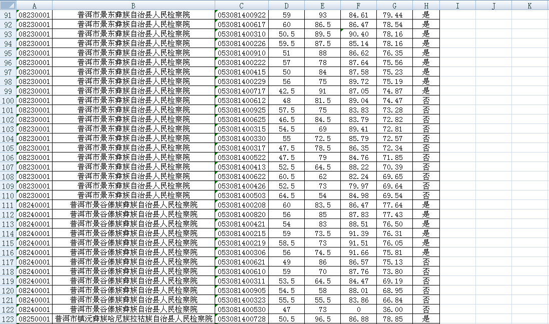 普洱市檢察機關2018年考試招聘聘用制書記員綜合成績名單