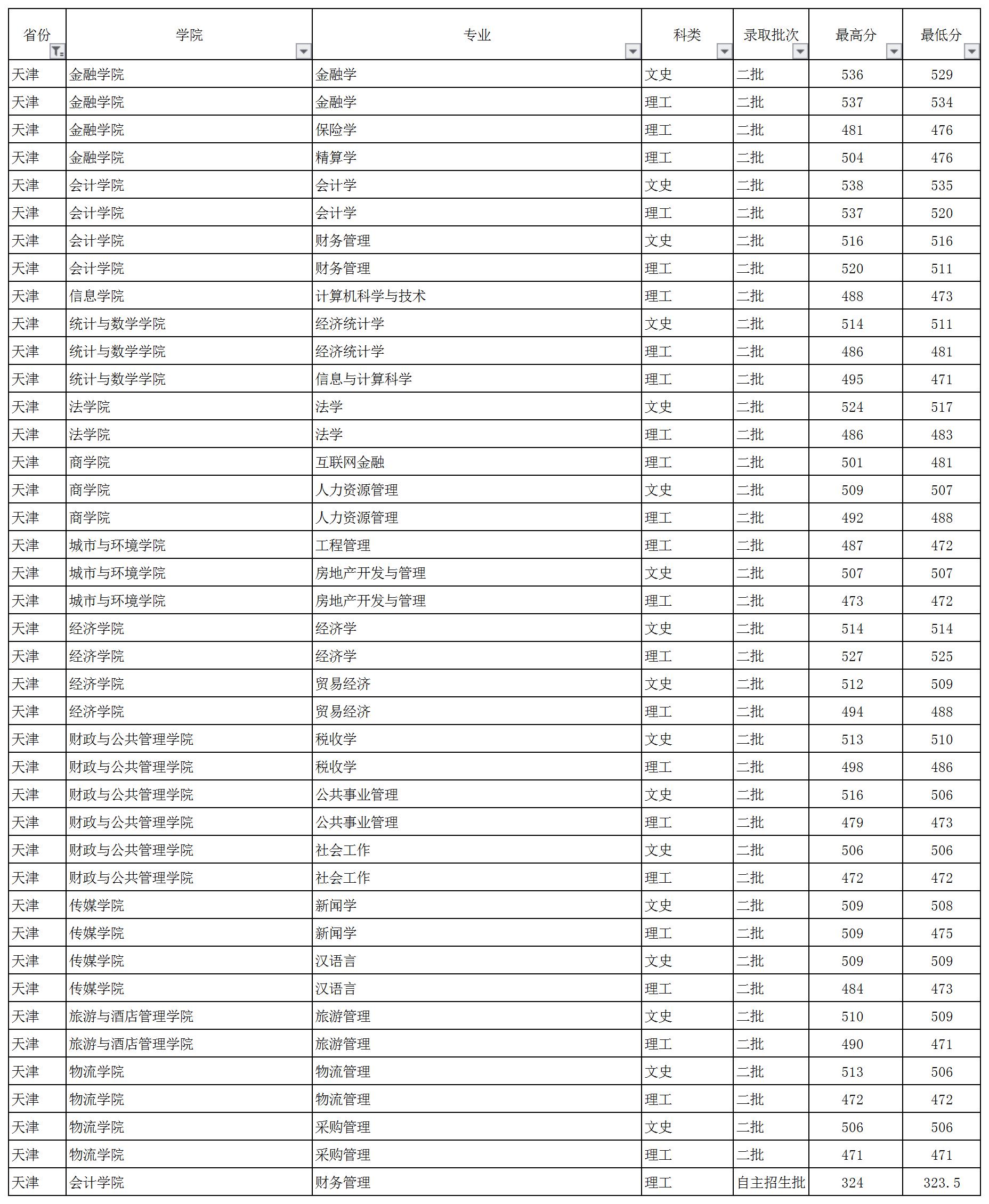 云南財經(jīng)大學(xué)2018年天津市錄取情況一覽表