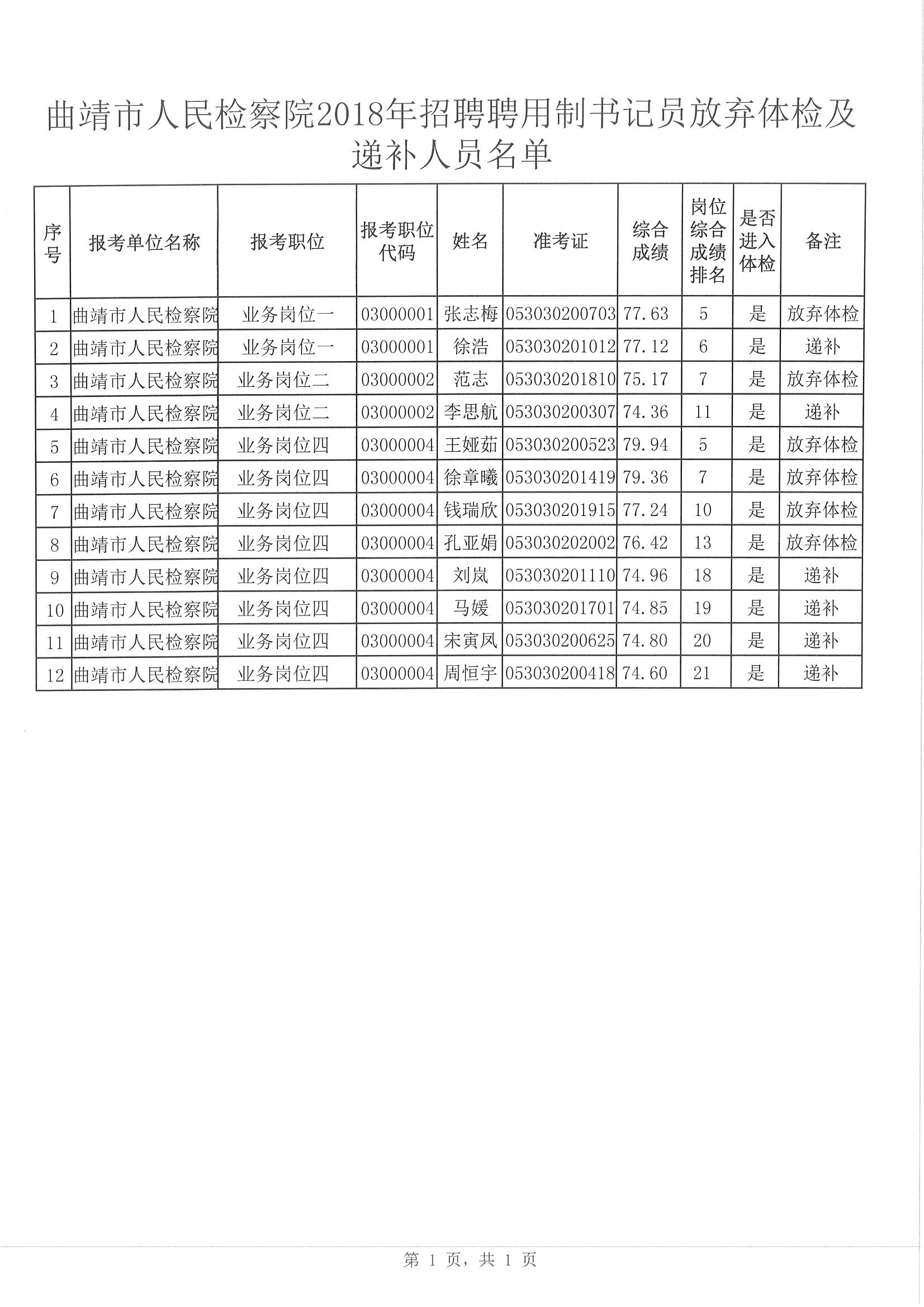 根據(jù)云南省檢察機(jī)關(guān)2018年考試招聘聘用制書記員相關(guān)規(guī)定,報(bào)考人員自愿放棄體檢的,按綜合成績(jī)崗位排名依次遞補(bǔ),現(xiàn)將自愿放棄體檢人員及遞補(bǔ)人員予以公告。