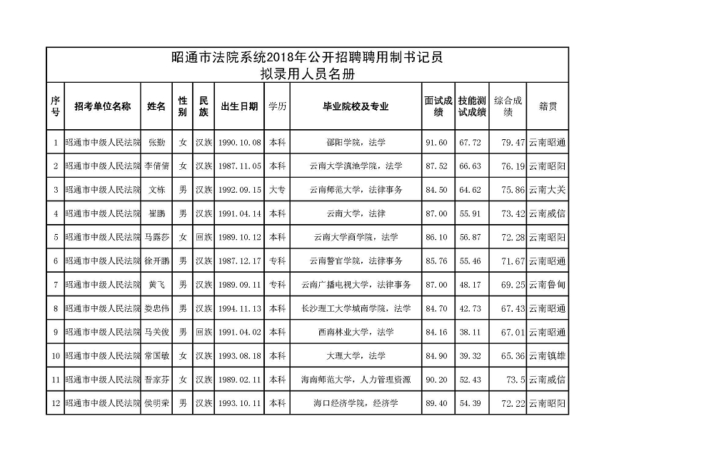 根據(jù)《云南省法院系統(tǒng)2018年公開招聘聘用制書記員公告》要求,按照云南省高級法院的統(tǒng)一安排部署,昭通市法院系統(tǒng)2018年公開招聘聘用制書記員筆試、技能測試、面試、體檢及考察程序均已結(jié)束,現(xiàn)將擬錄用考生情況公示如下: