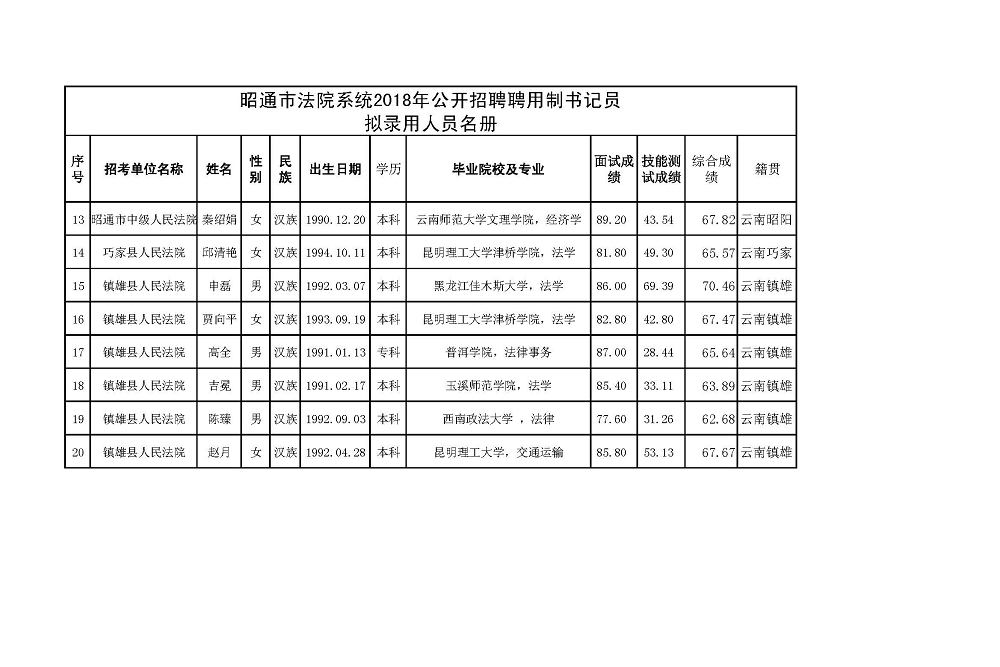 昭通市法院系統(tǒng)2018年公開招聘聘用制書記員擬錄用人員公示