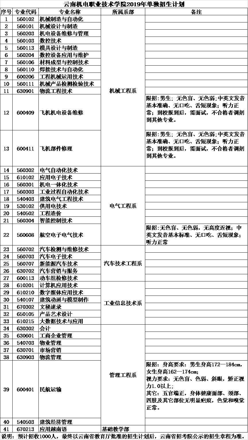 云南機電職業(yè)技術學院2019年單獨考試招生計劃