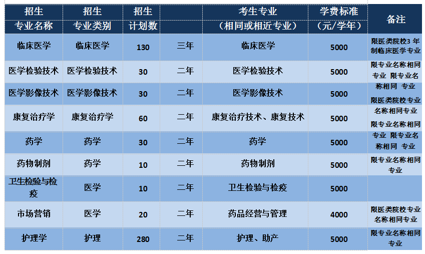 2019年我校專升本招生計劃為600名,招生專業(yè)涉及7個類別9個專業(yè),涵蓋臨床醫(yī)學(xué)類、醫(yī)學(xué)類、藥學(xué)類、護理類、醫(yī)學(xué)檢驗技術(shù)類和醫(yī)學(xué)影像技術(shù)類。