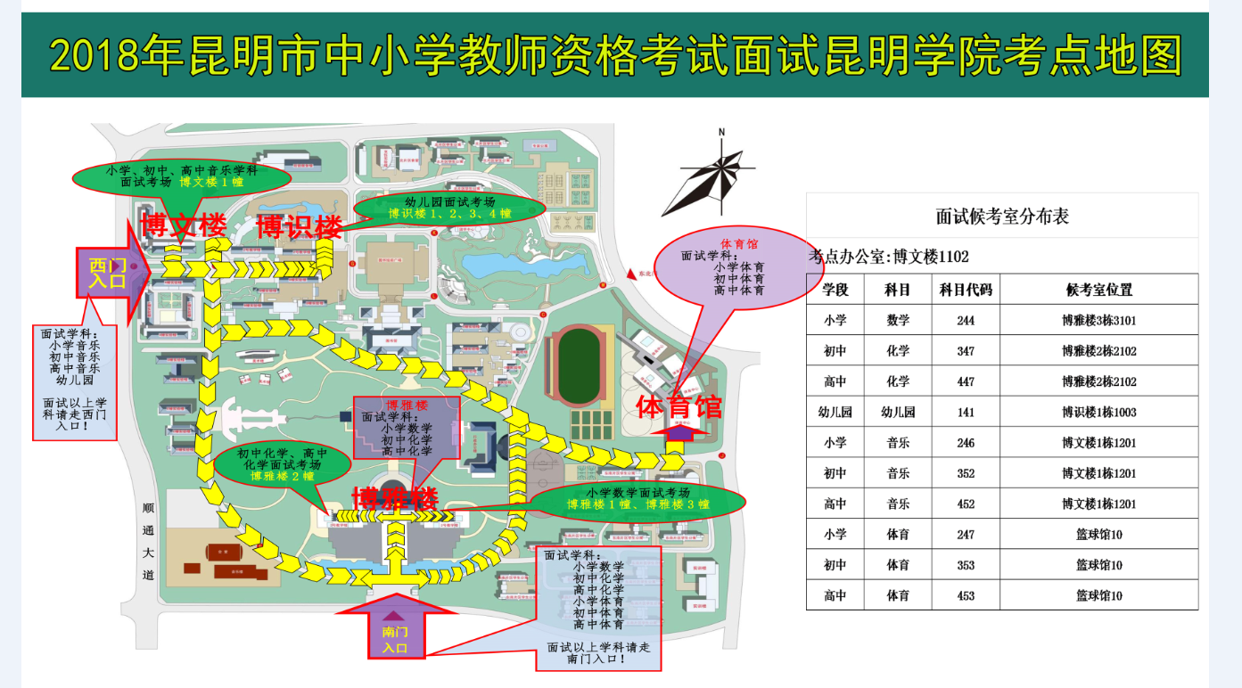昆明市2018年下半年教師資格國(guó)考面試考點(diǎn)地圖及候考室分布