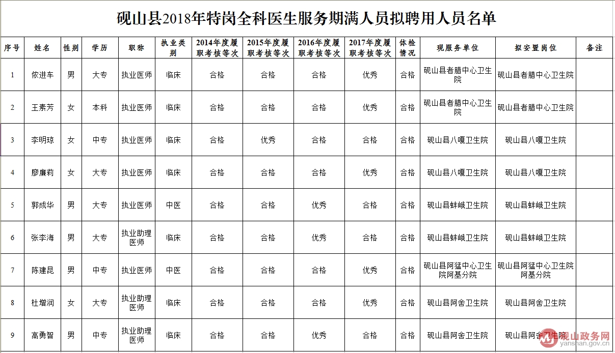 硯山縣2018年特崗全科醫(yī)生服務(wù)期滿人員擬聘用名單公示