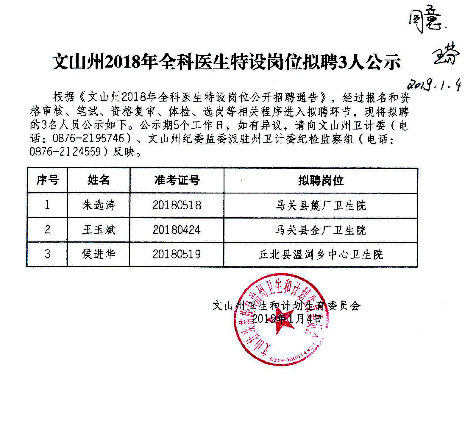 文山州2018年全科醫(yī)生特設(shè)崗位擬聘3人公示