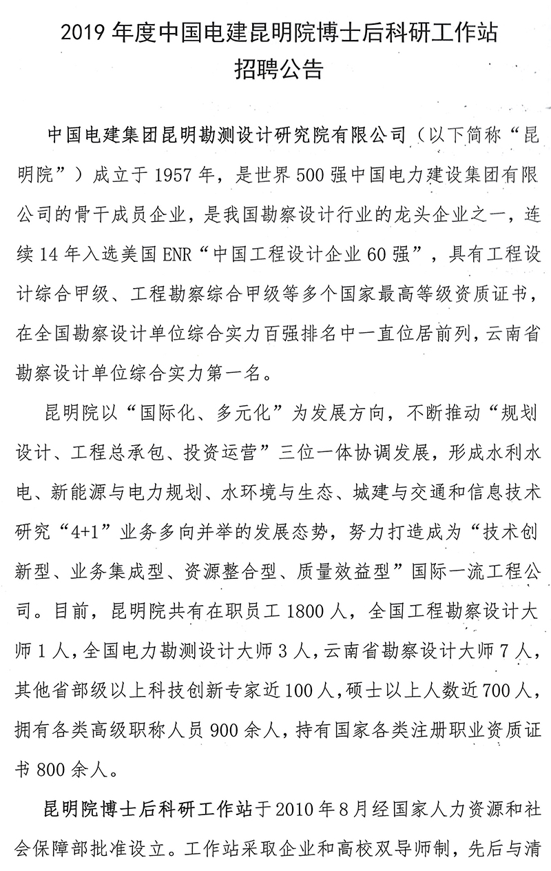 2019年度昆明院博士后人員招聘信息 | |||||||||