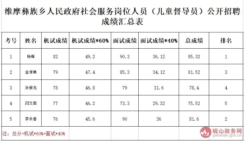 維摩彝族鄉(xiāng)人民政府社會服務(wù)崗位人員機試和面試已于2019年1月16日結(jié)束,根據(jù)招聘程序,現(xiàn)將機試成績、面試成績、總成績公告如下: