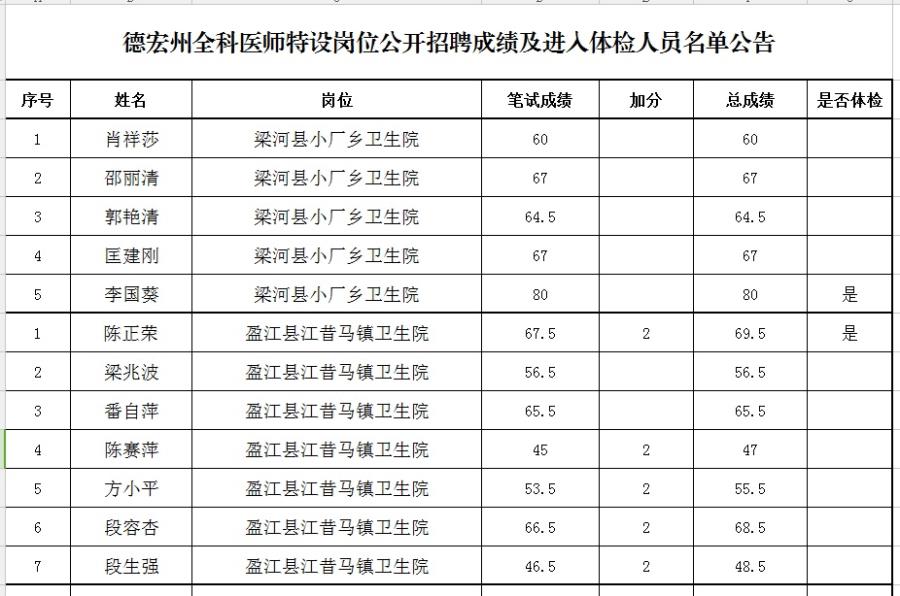 德宏州全科醫(yī)師特設(shè)崗位公開招聘成績及進(jìn)入體檢人員名單公告