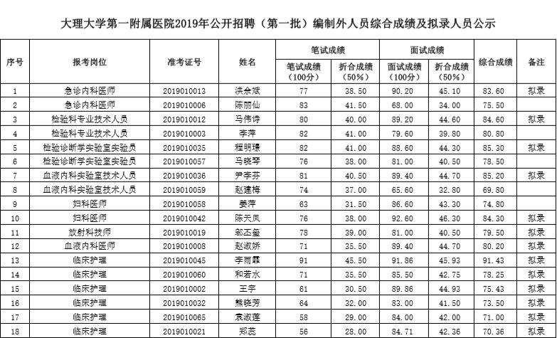 大理大學第一附屬醫(yī)院2019年公開 招聘(第一批)編制外人員綜合成績及擬錄人員公示