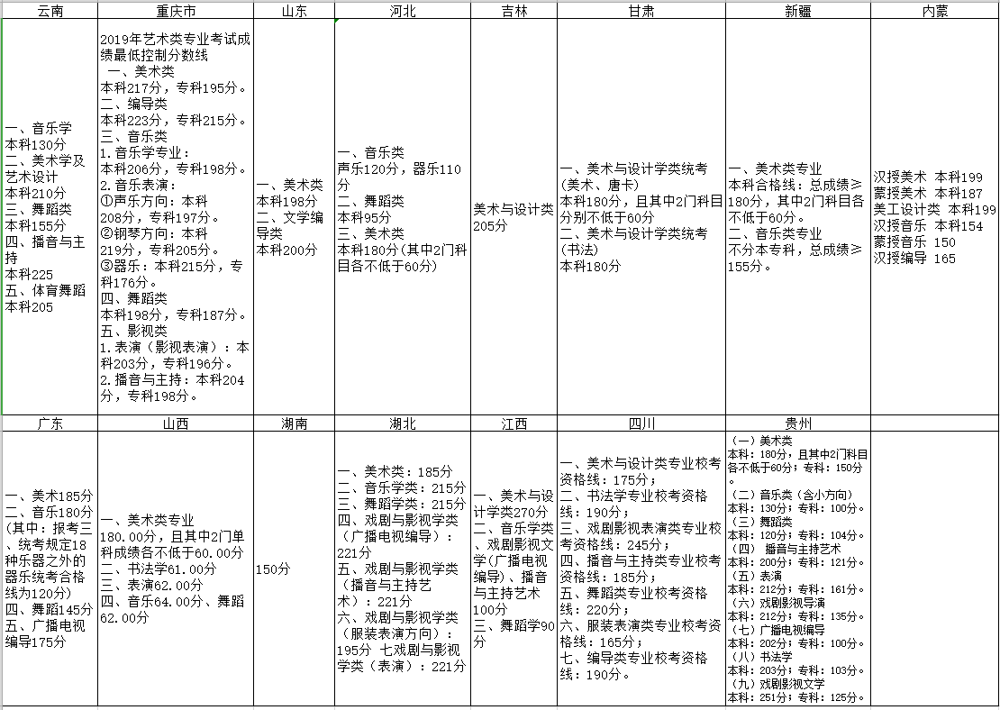 2019年各省藝術(shù)類統(tǒng)考合格分?jǐn)?shù)線