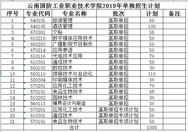 云南國防工業(yè)職業(yè)技術學院2019年單獨招生實施方案