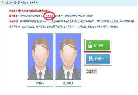 點擊“照片要求”中的“點擊下載”下載照片審核處理工具,處理報名照片,照片通過審核工具審核后,點擊“打開照片”按鈕選擇要上傳的照片,輸入驗證碼,點擊“保存照片”,上傳成功后跳轉到照片確認頁面,如下圖所示: