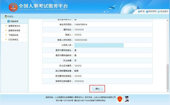 點擊“報名信息確認”按鈕后,跳轉到報名信息確認頁面,如下圖所示: