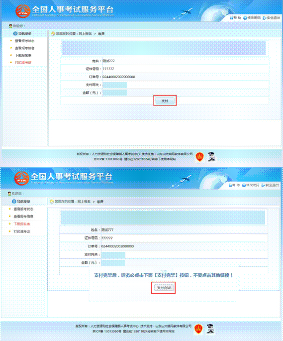 訂單確認無誤后,點擊“支付”按鈕,成功后再點擊“支付完畢”按鈕完成網(wǎng)上支付 操作,如下圖所示: