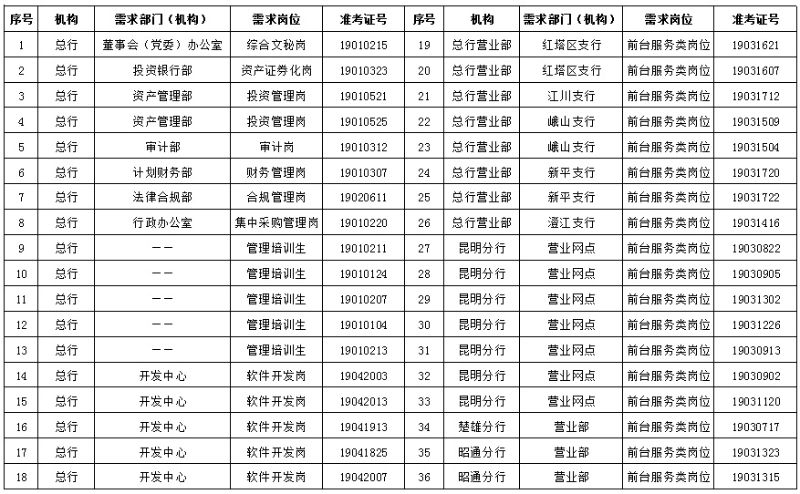 云南紅塔銀行2019年校園招聘考試已結(jié)束,現(xiàn)將入圍人員名單公示如下: