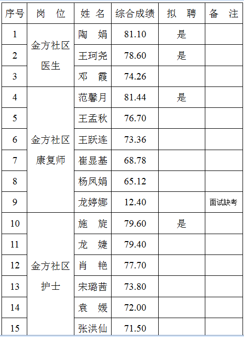 根據(jù)《云南昆鋼醫(yī)院2019年社區(qū)衛(wèi)生工作人員(非事業(yè)編制)招聘啟事》的相關安排,經(jīng)過現(xiàn)場報名、資格審查、筆試、面試、體檢等程序,經(jīng)醫(yī)院招聘人員工作領導小組辦公室審批,現(xiàn)將綜合成績和擬聘名單公示如下: