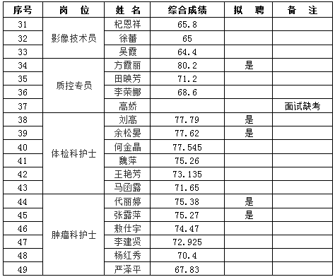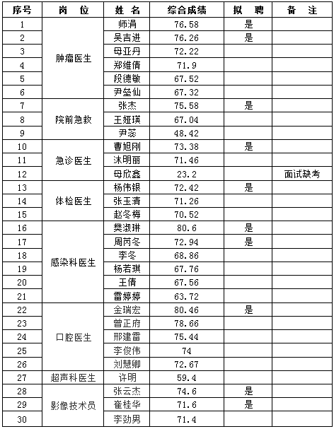 根據(jù)《云南昆鋼醫(yī)院2019年工作人員(非事業(yè)編制)招聘啟事》的相關(guān)安排,經(jīng)過(guò)現(xiàn)場(chǎng)報(bào)名、資格審查、筆試、面試、體檢等程序,經(jīng)醫(yī)院招聘人員工作領(lǐng)導(dǎo)小組辦公室審批,現(xiàn)將綜合成績(jī)和擬聘名單公示如下: