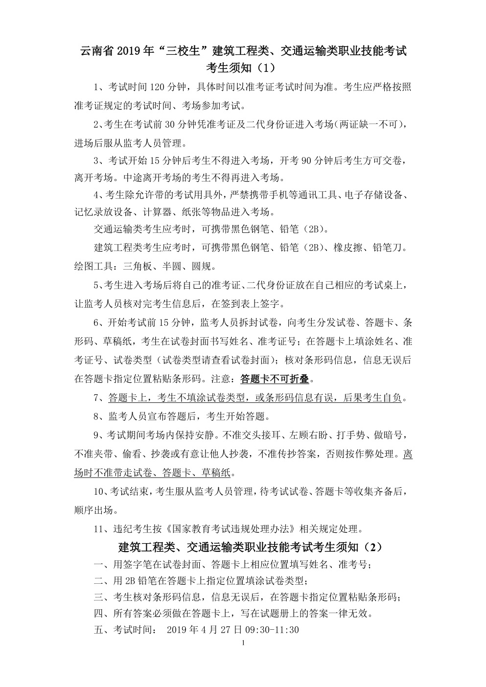 考生須知(云南省2019年“三校生”(建筑工程類和交通運(yùn)輸類)職業(yè)技能考試)