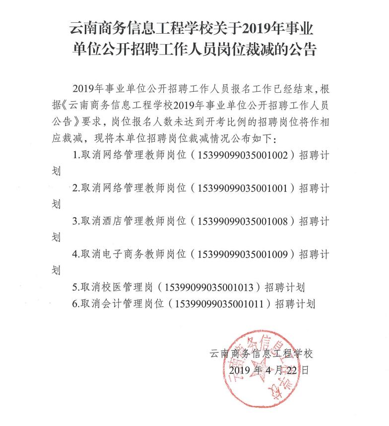 云南商務信息工程學校關于 2019年事業(yè)單位公開招聘工作人員崗位裁減的公告