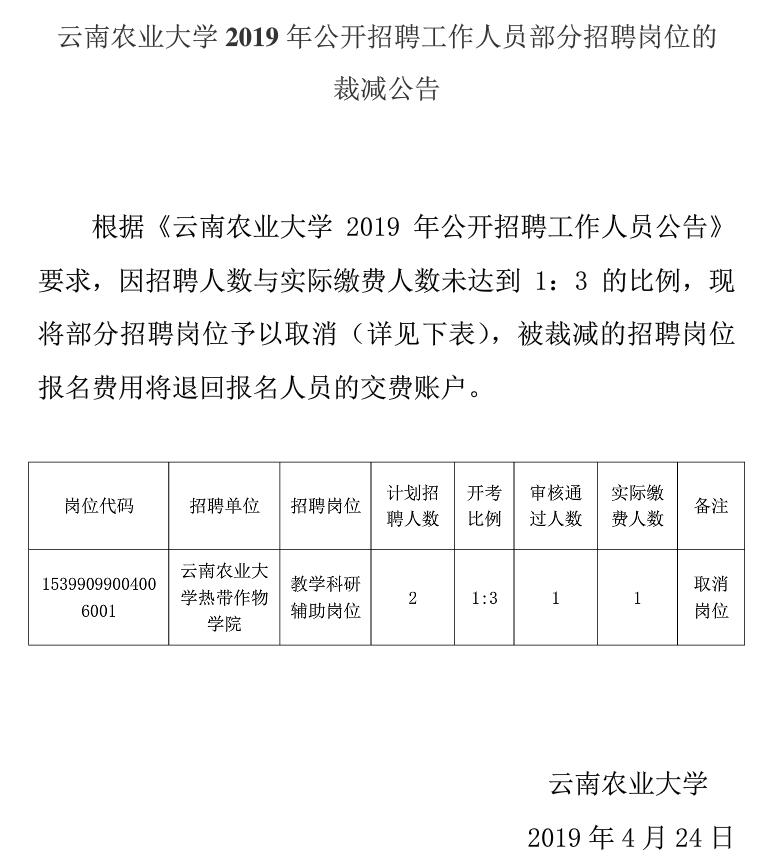 云南農(nóng)業(yè)大學(xué)2019年公開招聘工作人員部分招聘崗位裁減公告