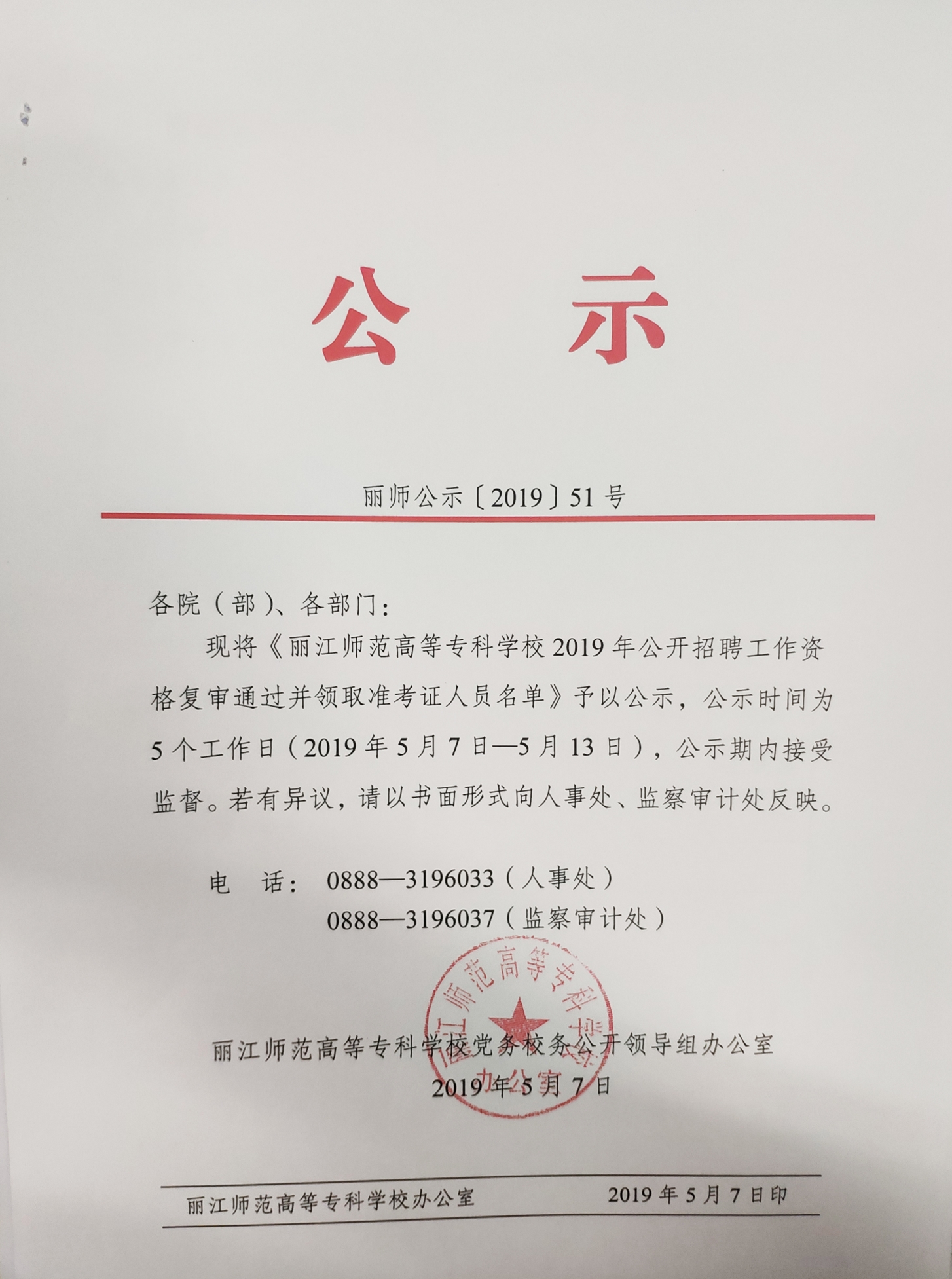 麗江師范高等??茖W(xué)校2019年公開招聘工作資格復(fù)審 通過并領(lǐng)取準考證人員名單的公示