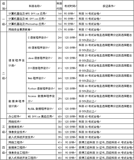 2019年下半年NCRE開考級別及科目
