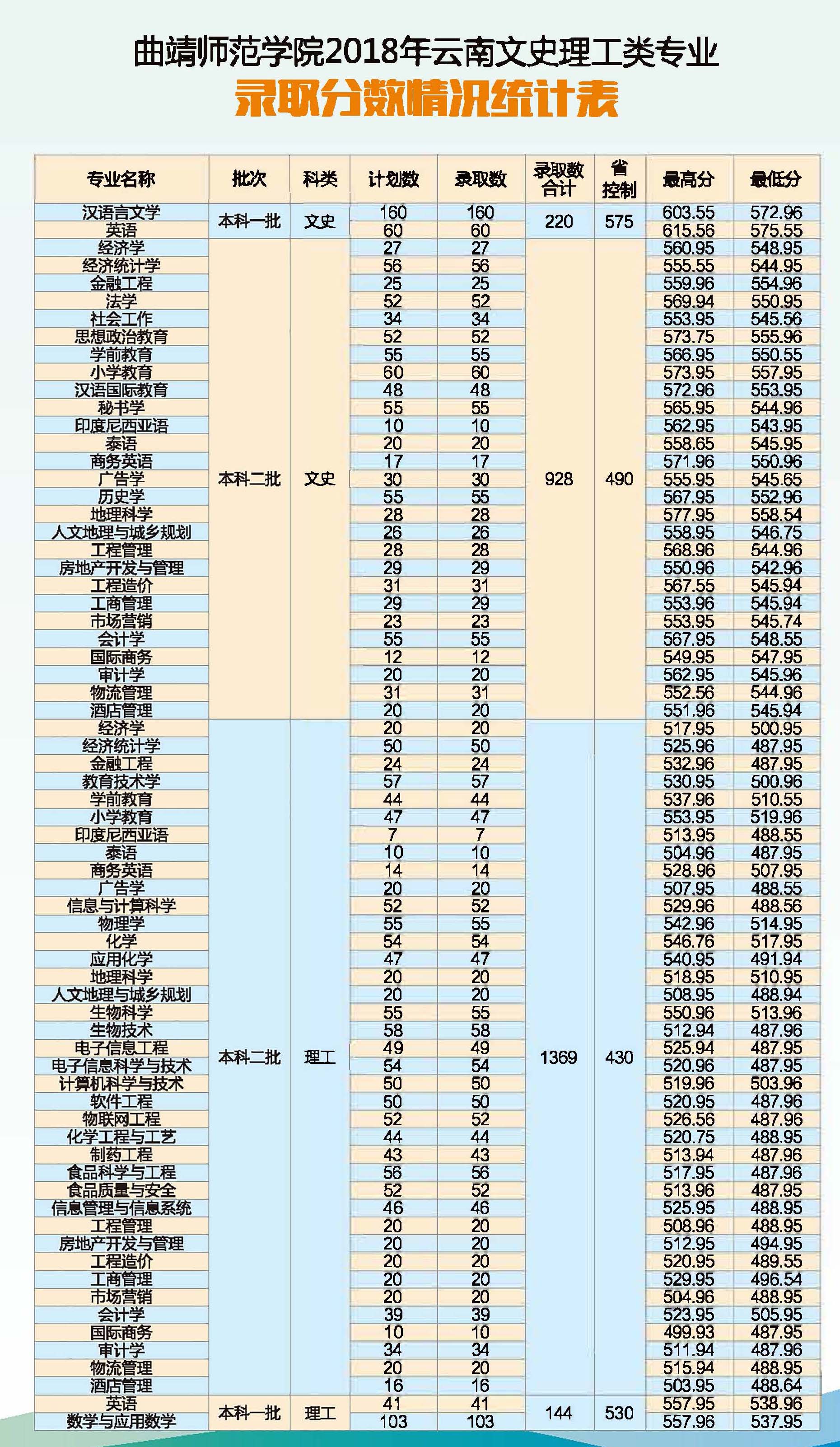 曲靖師范學(xué)院2018年云南文史理工類專業(yè)錄取分?jǐn)?shù)情況統(tǒng)計(jì)表