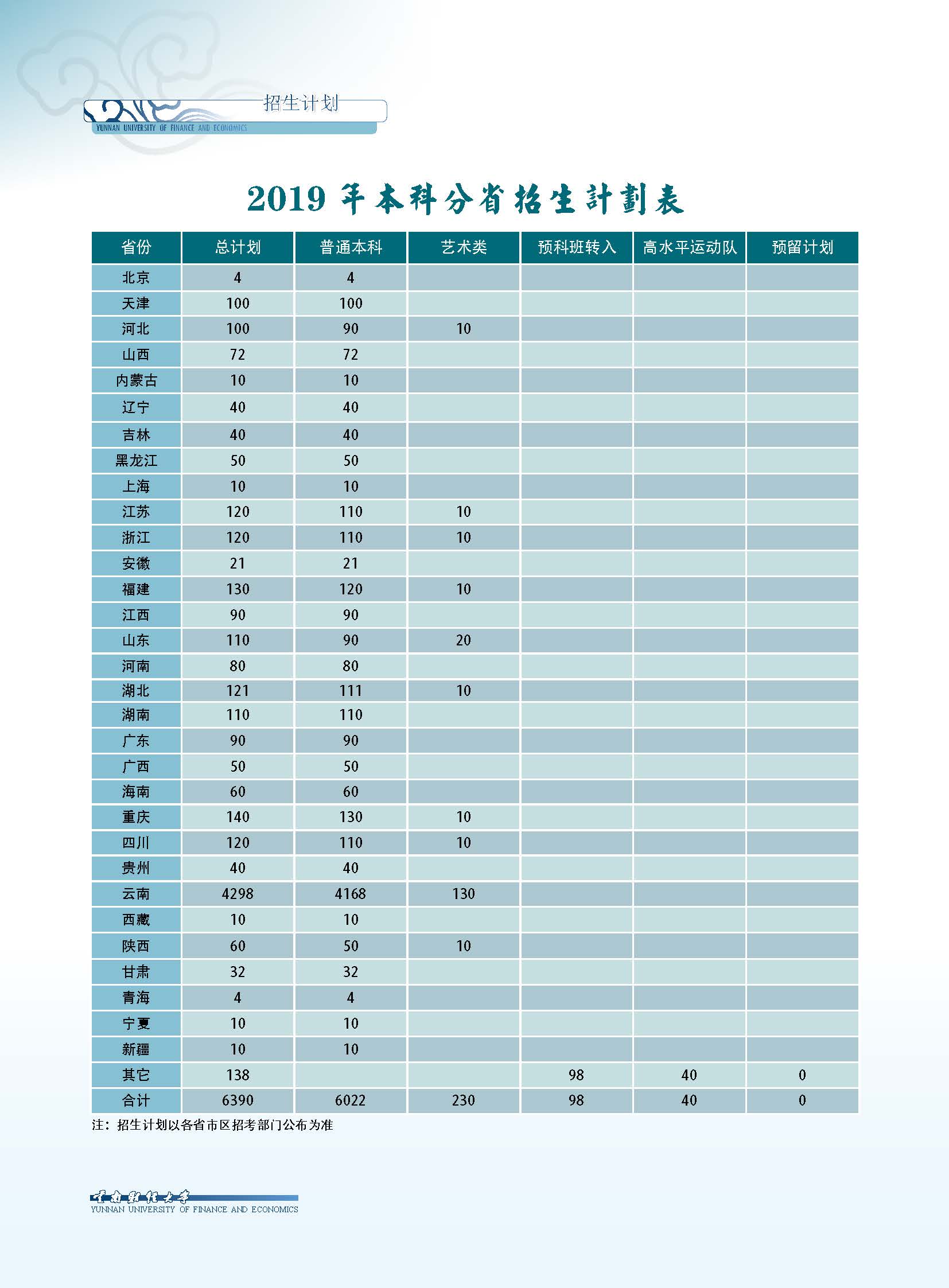 云南財(cái)經(jīng)大學(xué)2019年本科分省招生計(jì)劃表