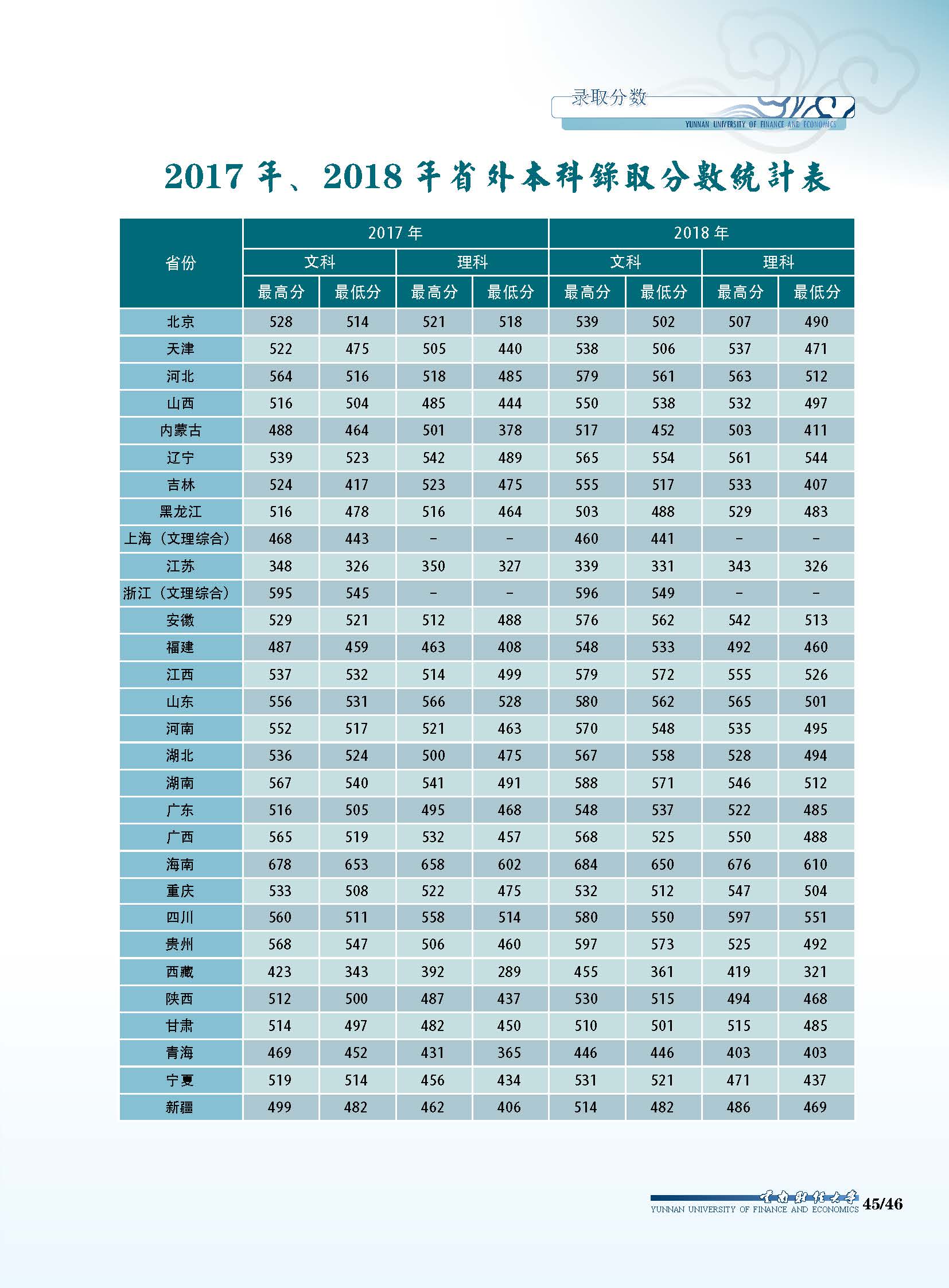 云南財(cái)經(jīng)大學(xué)2017、2018年省外本科錄取分?jǐn)?shù)統(tǒng)計(jì)表