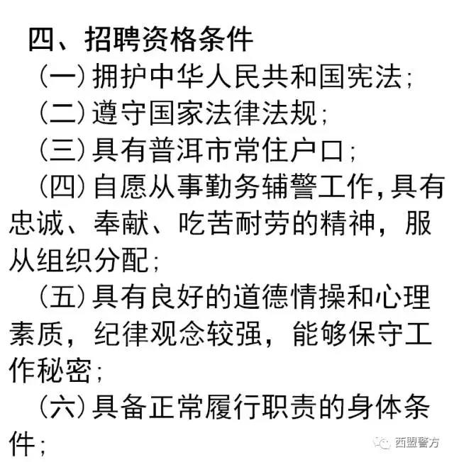 為有效緩解公安機關警力不足矛盾,充分利用社會優(yōu)質人力資源,優(yōu)化警力資源配置,進一步加強新形勢下公安反恐隊伍、應急處突力量建設,更好地履行公安機關職責,切實提升應急處置水平,增強駕馭復雜社會治安形勢和應急搶險救災能力,維護邊境地區(qū)和諧穩(wěn)定、保障人民生命財產(chǎn)安全,根據(jù)云南省人民政府辦公廳《關于印發(fā)云南省公安機關警務輔助人員管理辦法(試行)的通知》(云政辦發(fā)﹝2016﹞122號)的規(guī)定、《普洱市公安局 中共普洱市委機構編制辦公室 普洱市財政局 普洱市人力資源和社會保障局關于公安機關公開招聘勤務輔警的通知》普公發(fā)[2017]22號和西盟佤族自治縣人民政府《關于印發(fā)西盟縣特勤隊伍建設實施方案的通知》(西政發(fā)[2017]98號),現(xiàn)將公開招聘的有關事項公告如下: