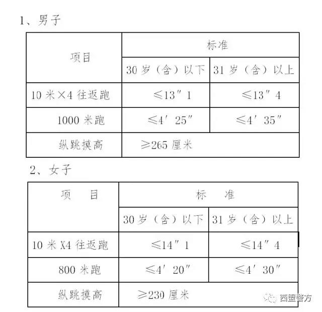 注:體能測試由西盟縣公安局組織實施,其中縱跳摸高可測試三次,取最好成績;10米×4往返跑、1000米跑只能測試一次。