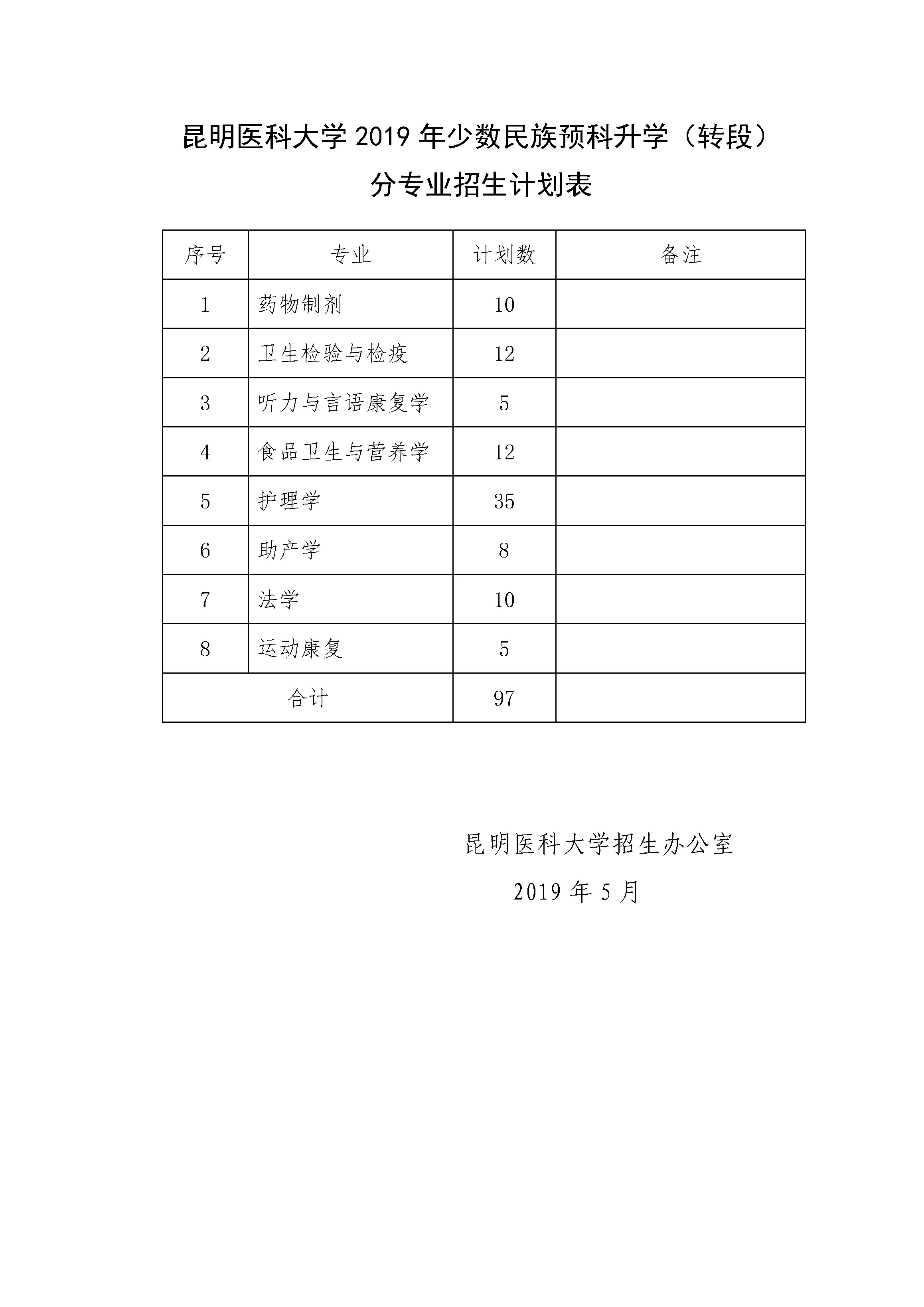 昆明醫(yī)科大學(xué)2019年少數(shù)民族預(yù)科升學(xué)(轉(zhuǎn)段)分專業(yè)招生計劃表