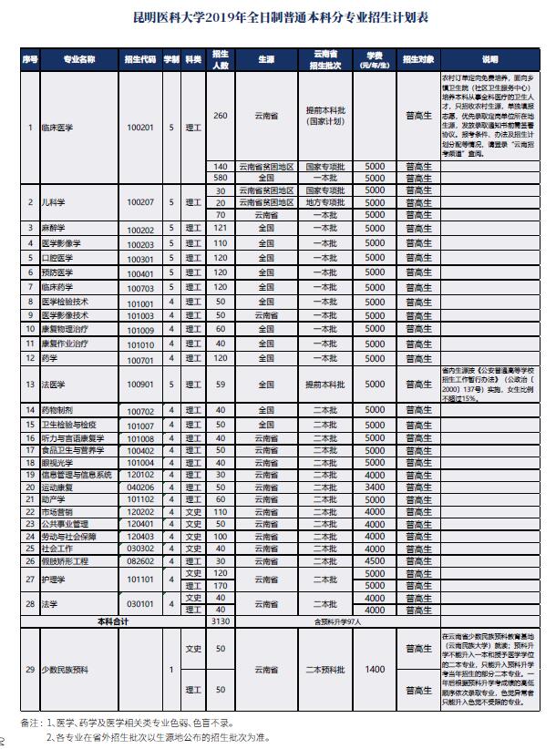昆明醫(yī)科大學(xué)2019年全日制普通本科分專業(yè)招生計劃表