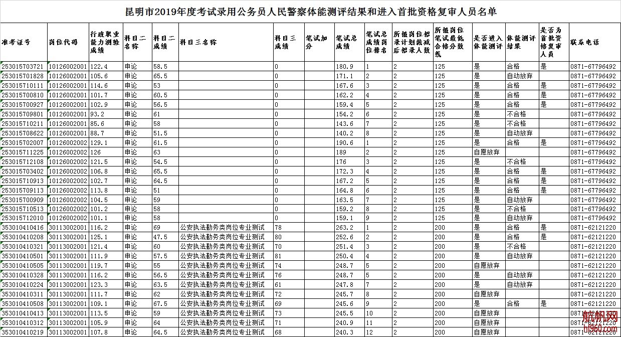 昆明市2019年度考試錄用人民警察體能測(cè)評(píng)結(jié)果 和進(jìn)入首批資格復(fù)審人員名單