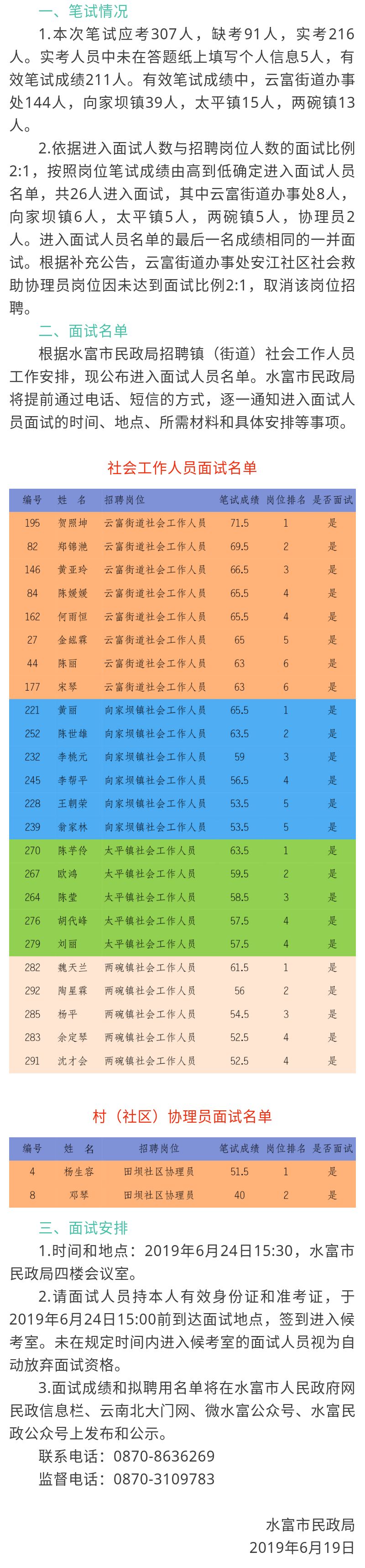 2019年昭通水富市民政局招聘社會工作人員筆試成績和面試公告