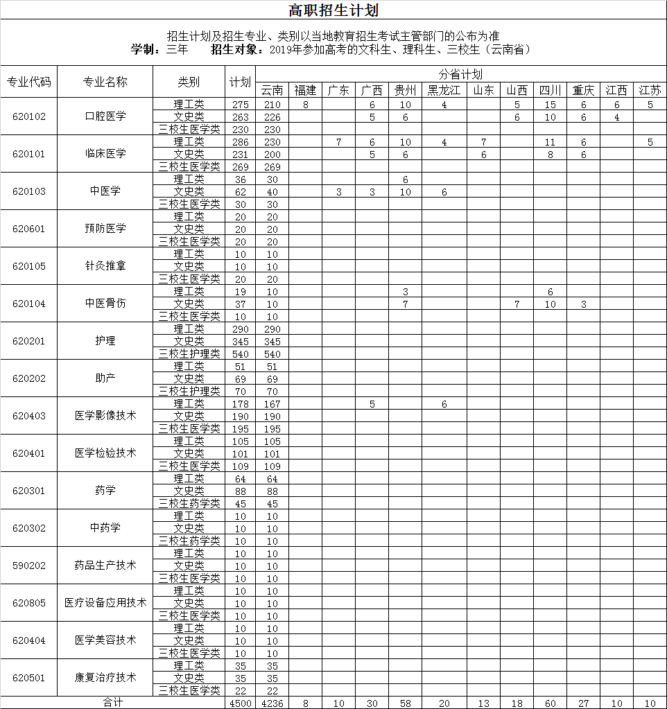 2019年昆明衛(wèi)生職業(yè)學院高職專科分省招生計劃