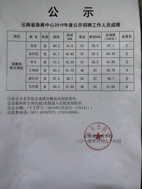 云南省急救中心2019年度公開招聘工作人員成績公示