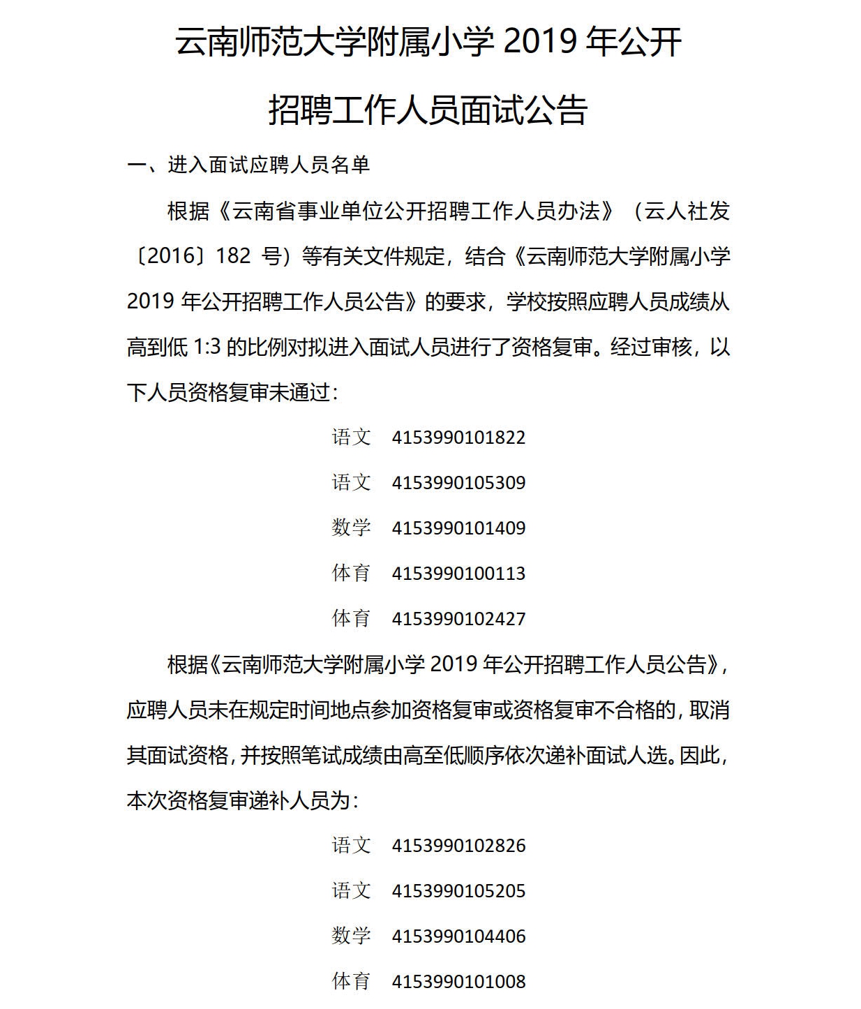 云南師范大學(xué)附屬小學(xué)2019年招聘面試公告