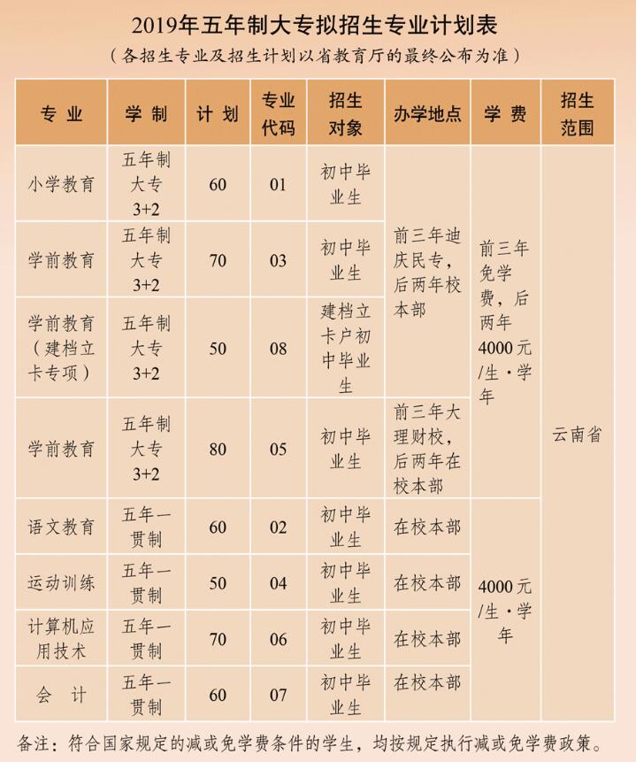 2019年麗江師范高等專科學(xué)校五年制大專招生計劃表