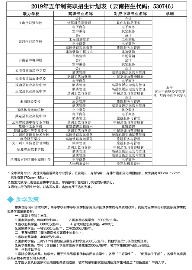 云南旅游職業(yè)學(xué)院2019年五年制高職招生計劃表