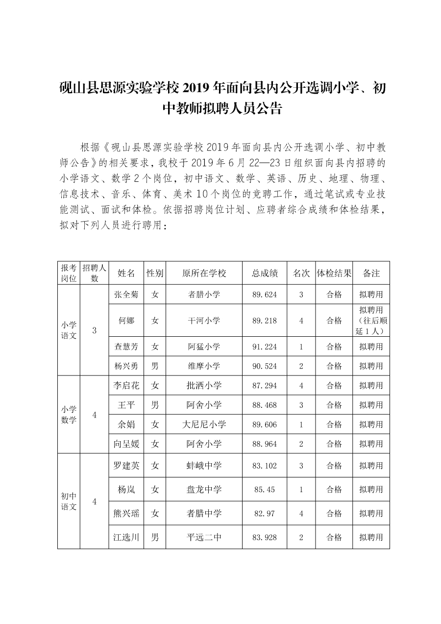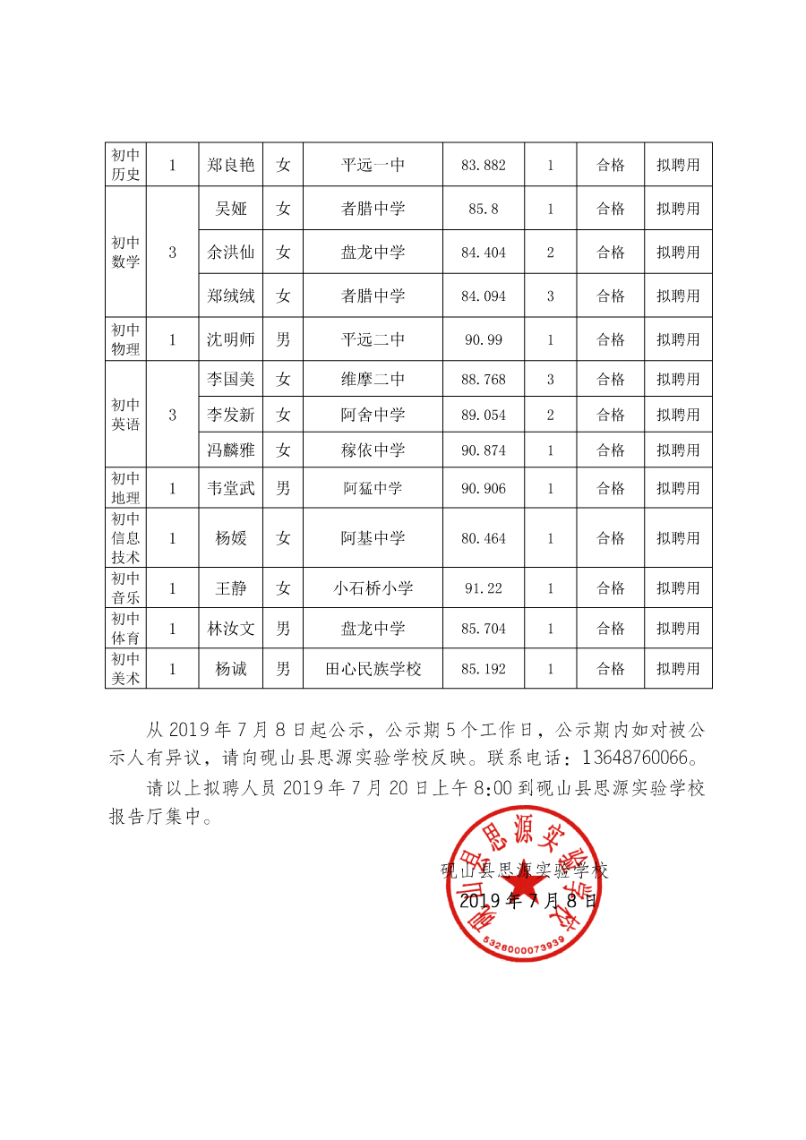 硯山縣思源實驗學校2019年面向縣內(nèi)公開選調(diào)小學、初中教師擬聘人員公告