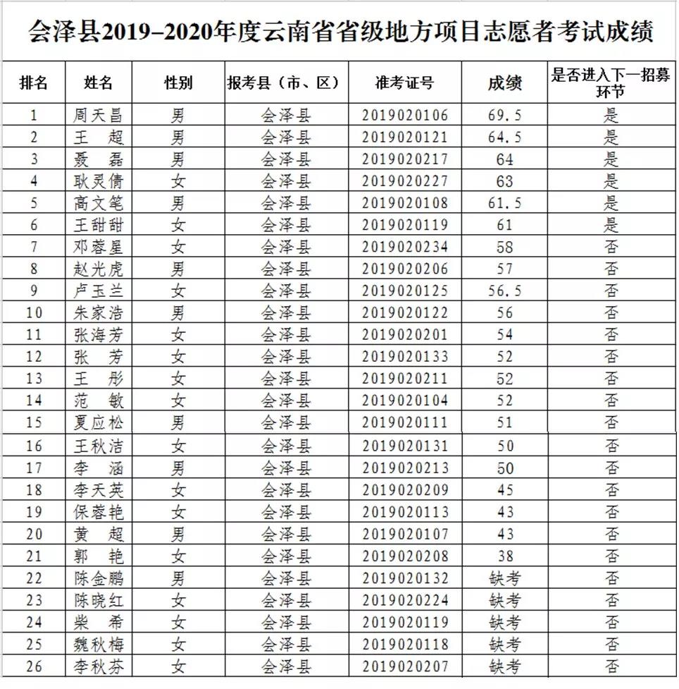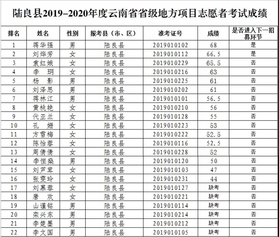 根據(jù)《共青團云南省委 云南省教育廳 云南省財政廳 云南省人力資源和社會保障廳轉(zhuǎn)發(fā)<關(guān)于進一步加強云南省大學(xué)生志愿服務(wù)西部計劃工作的意見>的通知》(云青聯(lián)〔2016〕11號)和《關(guān)于印發(fā)《2019—2020年度大學(xué)生志愿服務(wù)西部計劃云南省實施方案》的通知》(云志項辦通〔2019〕4號)等文件精神及曲靖2019-2020年度大學(xué)生志愿服務(wù)西部計劃省級地方項目志愿者招募程序,本次筆試報考人數(shù)為68人,應(yīng)試54人,缺考14人,現(xiàn)將筆試成績及面試相關(guān)事項公告如下: