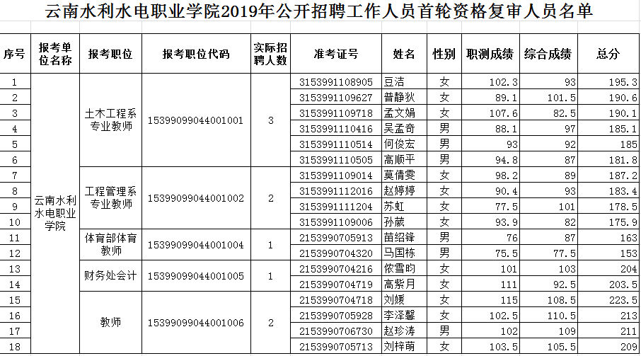 根據《公告》規(guī)定,每個崗位進入資格復審人員,按照資格復審人數與招聘崗位人數2:1的比例,按筆試成績從高到低順序確定(附件1),由云南水利水電職業(yè)學院組織資格復審。